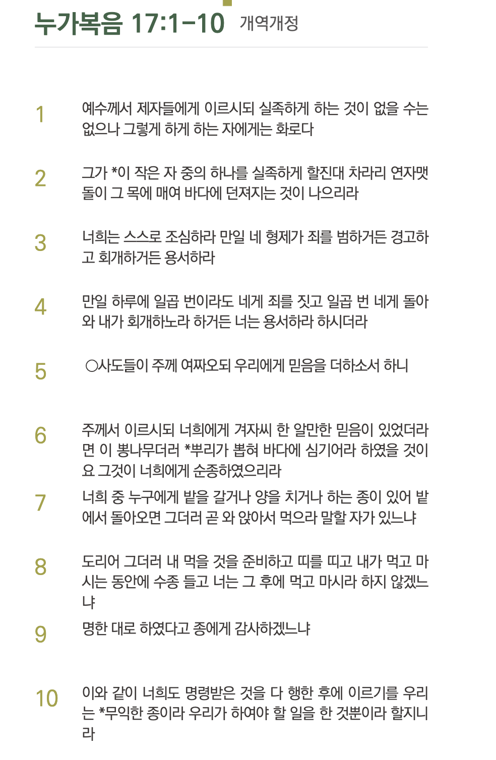 5절에서 사도들은, 앞선 말씀(실족시키지 말라, 용서하라)을 실천할 수 없는 어려운 말씀이란 것을 깨닫고 믿음을 달라고 예수님께 요청한다.