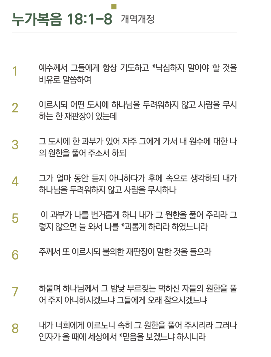 하물며 의로운 재판장이신 하나님께서 택하신 자들의 원한을 풀어주지 않겠냐고 말씀하신다.(7)