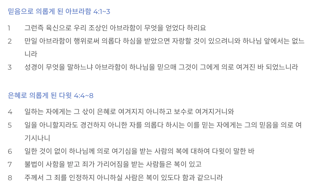 오직 예수 그리스도를 믿음으로 구원을 받음을 말한 바울은오늘 본문에서는 유대인들이 가장 존경하는 두 인물 아브라함(1-3)과 다윗(4-8)에 대해서 말합니다. 아브라함은 하나님의 택함 받은 백성 이스라엘의 조상입니다. 그런데, 그는 모세의 율법이 있기 전에 있던 자입니다. 그렇기 때문에 율법 준수가 칭의의 조건이 될 수 없다는 것을 보여줍니다. 그렇다면 아브라함은 어떻게 의롭다 여김 받았을까요.그 또한 하나님 앞에서 행위로써 인정받을 순 없었습니다.(2)성경은 그가 믿음으로 의롭다 여겨졌다고 말합니다. 아브라함은 전적으로 하나님을 믿었기 때문에, 의롭다 여겨졌습니다. 여기서 포인트는, 1.하나님을 믿음이 어떻게 구원의 믿음이 되는가?아브라함이 예수님을 인격적으로 알지 못했음에도 그의 믿음이 구원에 이..