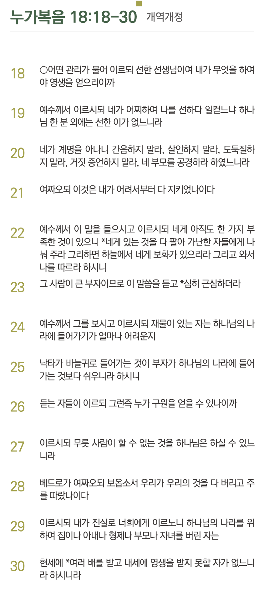 스스로 의롭다 칭하며 죄를 인정하지 않는 바리새인보다, 스스로 죄인이라 칭하며, 하나님의 자비를 바라는 자가 의롭다 하심을 받고(14)어린아이와 같이 하나님 나라를 받아들이는 자가 하나님 나라에 들어간다고(17) 말씀하신 이후에오늘 본문이 시작됩니다. 어떤 관리가 예수님께 나아와 물어봅니다. 어떻게 하여야 영생을 얻습니까?(18) 영생은 죽은 후에 간단히 말하면, 하나님 나라에 들어가는 것을 의미합니다.당시 유대인의 관점에서, 죽음 이후 부활하여, 다가올 메시야 시대(오는 세상)에 구성원으로 참여하는 복된 삶을 말합니다. 그리고 유대인들은 그 영생을 ‘무엇을 하여’ 즉, 자신의 노력과 행위로 성취하는 것으로 이해했습니다. 19절 말씀은 예수님이 자신의 말씀의 권위를 알려주기 위해서 언급하신 것입니다.“하..